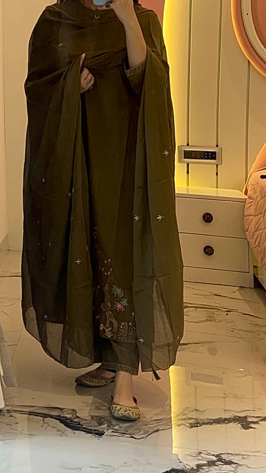 Pure Premium Mehandi Embroidered Cotton kurta Set with Dupatta (38 to 46)