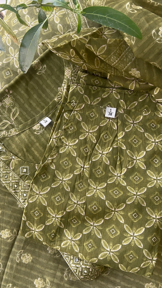 Womenâs Olive Green Block Print Cotton Kurta Set with Dupatta (38 to 52)